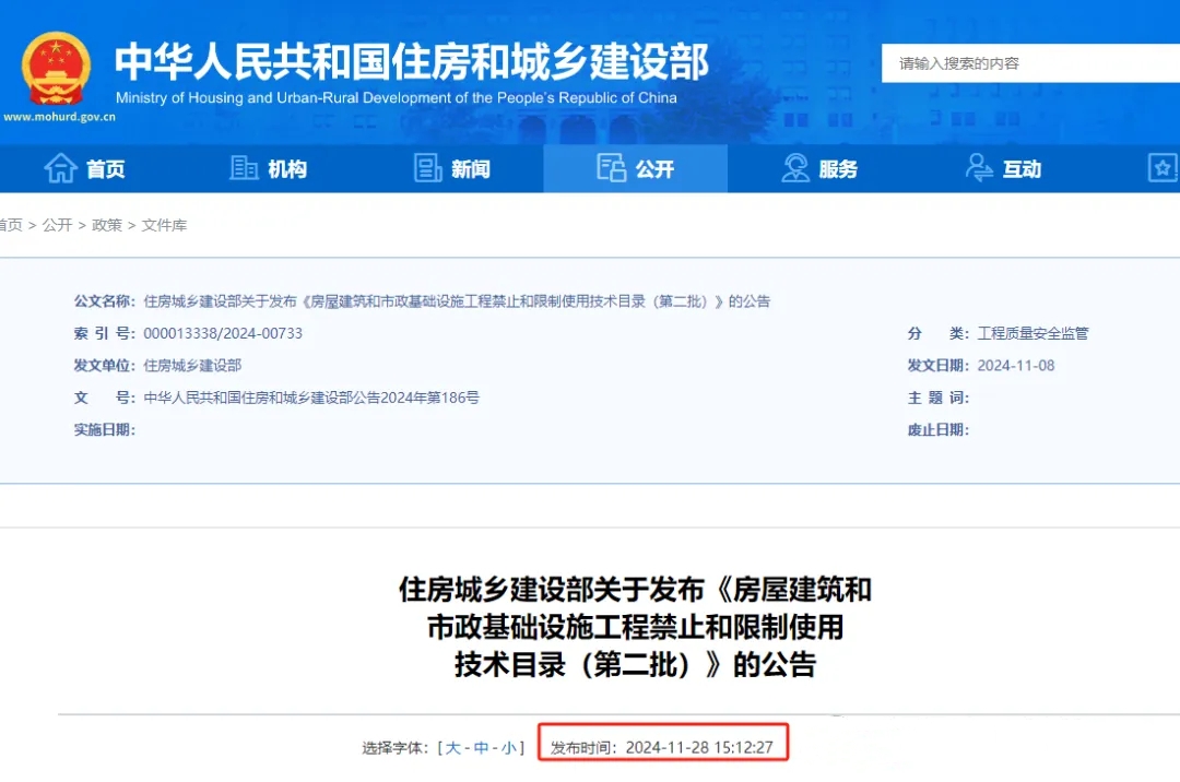 住建部发布关于发布《房屋建筑和市政基础设施工程禁止和限制使用技术目录(第二批)》的公告(中华人民共和国住房和城乡建设部公告2024年第186号)。