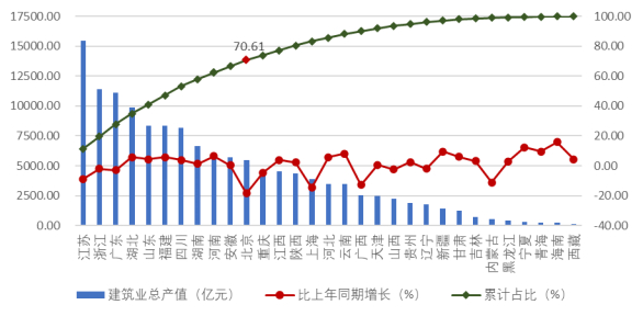 2025 年上半年,江苏、浙江、广东建筑业总产值均超过了1万亿元,分别达到15455.97亿元、11393.61亿元和11092.06亿元,分别占全国建筑业总产值的11.30%、8.33%和8.12%。此外,总产值超过5000亿元的还有湖北、山东、福建、四川、湖南、河南、安徽、北京共8个地区,上述 11 省市完成的建筑业总产值占全国建筑业总产值的70.61%。从各地区建筑业总产值增长情况看,21个地区的建筑业总产值较上年同期都有不同幅度的增长。其中,海南的增幅最大,达到了15.79%。宁夏的增幅达到12.43%。10个地区的建筑业总产值较上年同期出现下降,其中北京、上海、广西、内蒙古的降幅均超过10%(图 1)。