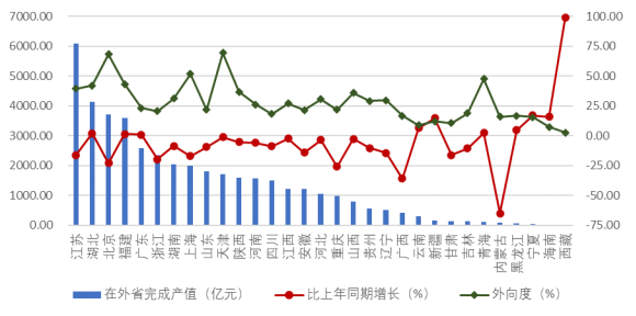 图 2 2025 年上半年各地区在外省完成的建筑业总产值及外向度
