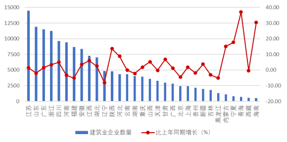 图 3 2025 年上半年各地区建筑业企业数量及其增长情况