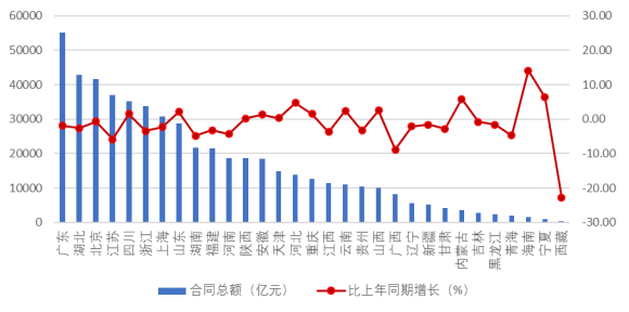 2025 年上半年,广东、湖北、北京、江苏、四川、浙江、上海7个地区建筑业企业签订合同总额均超过30000亿元,分别达到55186.12亿元、42908.67亿元、41635.43亿元、37053.93亿元、35232.36亿元、33690.69亿元和30820.35亿元。合同总额超过 20000 亿元的还有山东、湖南、福建3个地区。12个地区合同总额出现增长,同比增长最快的是海南,达到了14.06%。19个地区合同总额出现负增长,其中西藏的负增长达到22.74%(图6)。