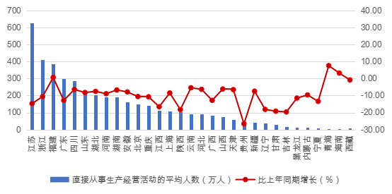 图 4 2025 年上半年各地区直接从事生产经营活动的平均人数及其增长情况