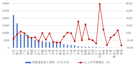 2025 年上半年,江苏、浙江建筑业企业房屋建筑竣工面积均超过1亿平方米,分别达到2.21亿平方米、1.65亿平方米。房屋建筑竣工面积超过 5000万平方米的还有湖南、广东、湖北、福建、山东、四川等 6个地区。7个地区的房屋建筑竣工面积出现增长,其中,内蒙古、天津、新疆3个地区的房屋建筑竣工面积增幅分别达到了78.25%、30.90%和23.11%。24个地区房屋建筑竣工面积出现负增长,其中青海、吉林的负增长均超过30%(图9)。