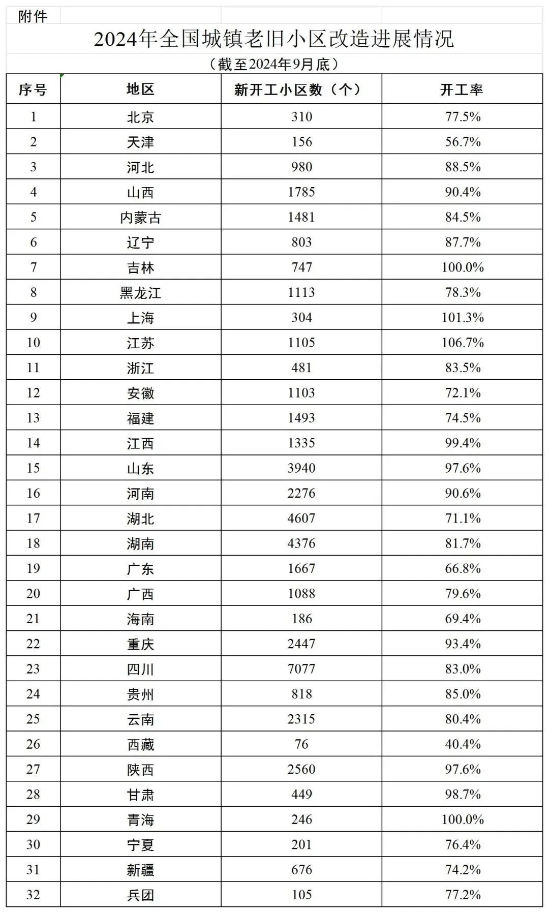近日,据住建部官网消息,2024年,全国计划新开工改造城镇老旧小区5.4万个。根据各地统计上报数据,1-9月份,全国新开工改造城镇老旧小区4.8万个。分地区看,江苏、上海、吉林、青海4个地区已全部开工,具体如下: