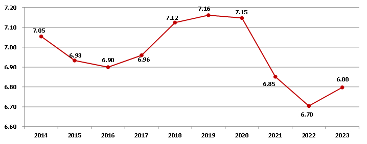 自2014年以来,建筑业增加值占国内生产总值的比例始终保持在6.70%以上,2023年为6.80%(图2),建筑业国民经济支柱产业的地位稳固。