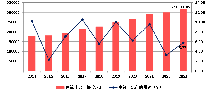 2014年以来,随着我国建筑业企业生产和经营规模的不断扩大,建筑业总产值持续增长,2023年达到315911.85亿元,比上年增长5.77%。增速较上年提高2.52个百分点(图3)。