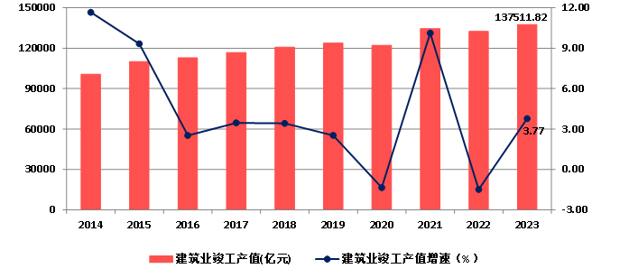 图3 2014-2023年全国建筑业总产值及增速