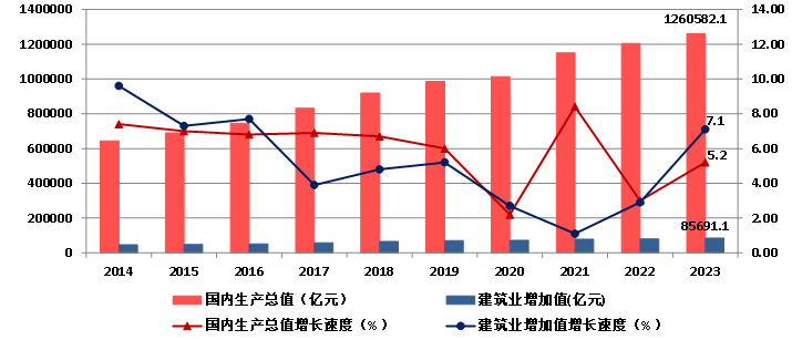 图1 2014-2023年国内生产总值、建筑业增加值及增速