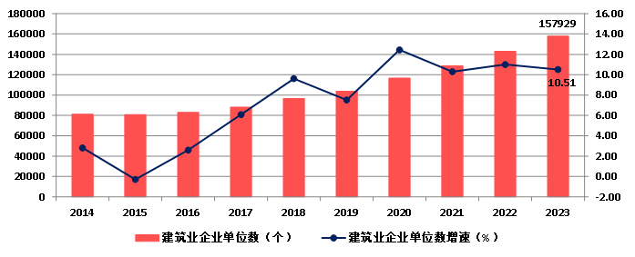 截至2023年底,全国共有建筑业企业157929个,比上年增加15023个,增长10.51%(图7)。国有及国有控股建筑业企业10060个,占建筑业企业总数的6.37%。