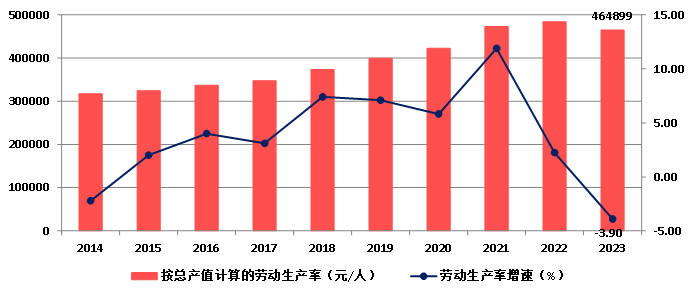 2023年,按建筑业总产值计算的劳动生产率为464899元/人,比上年下降3.90%,增速比上年降低6.14个百分点,增速连续两年下降(图8)。