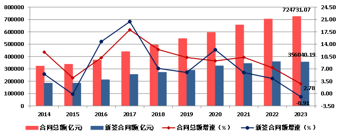 图10 2014-2023年全国建筑业企业签订合同总额、新签合同额及增速