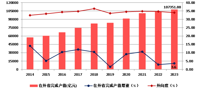 图5 2014-2023年全国建筑业外向度、在外省完成产值及增速