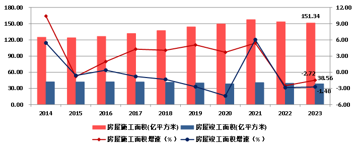 2023年,全国建筑业企业房屋建筑施工面积151.34亿平方米,比上年减少1.48%。房屋建筑竣工面积38.56亿平方米,比上年减少2.72%(图12)。