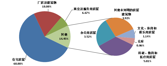 从全国建筑业企业房屋竣工面积构成情况看,住宅竣工面积占最大比重,为60.80%;厂房及建筑物竣工面积占18.08%;商业及服务用房竣工面积占6.67%;其他种类房屋竣工面积占比均在5%以下(图13)。