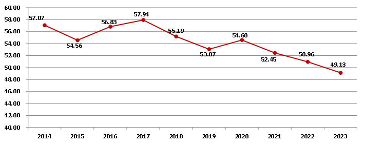 图11 2014-2023年全国建筑业企业新签合同额占合同总额比例