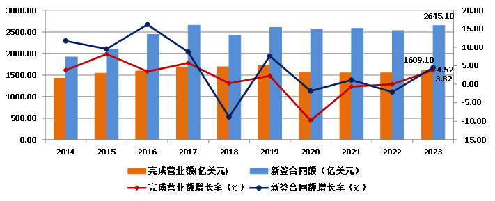 2023年,我国对外承包工程业务完成营业额1609.1亿美元,比上年增长3.83%,新签合同额2645.1亿美元,比上年增长4.52%(图14)。