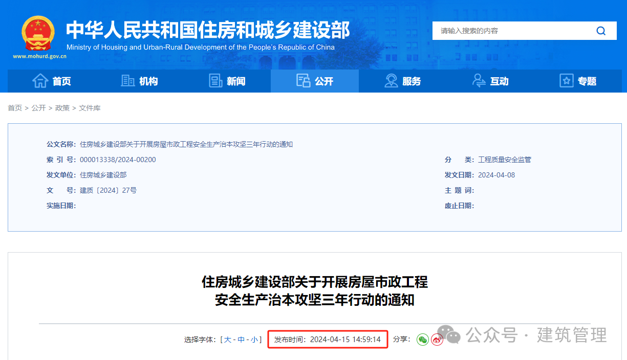 2024年4月15日,住建部发布《关于开展房屋市政工程安全生产治本攻坚三年行动的通知》(建质〔2024〕27号)。其中特别提出:
