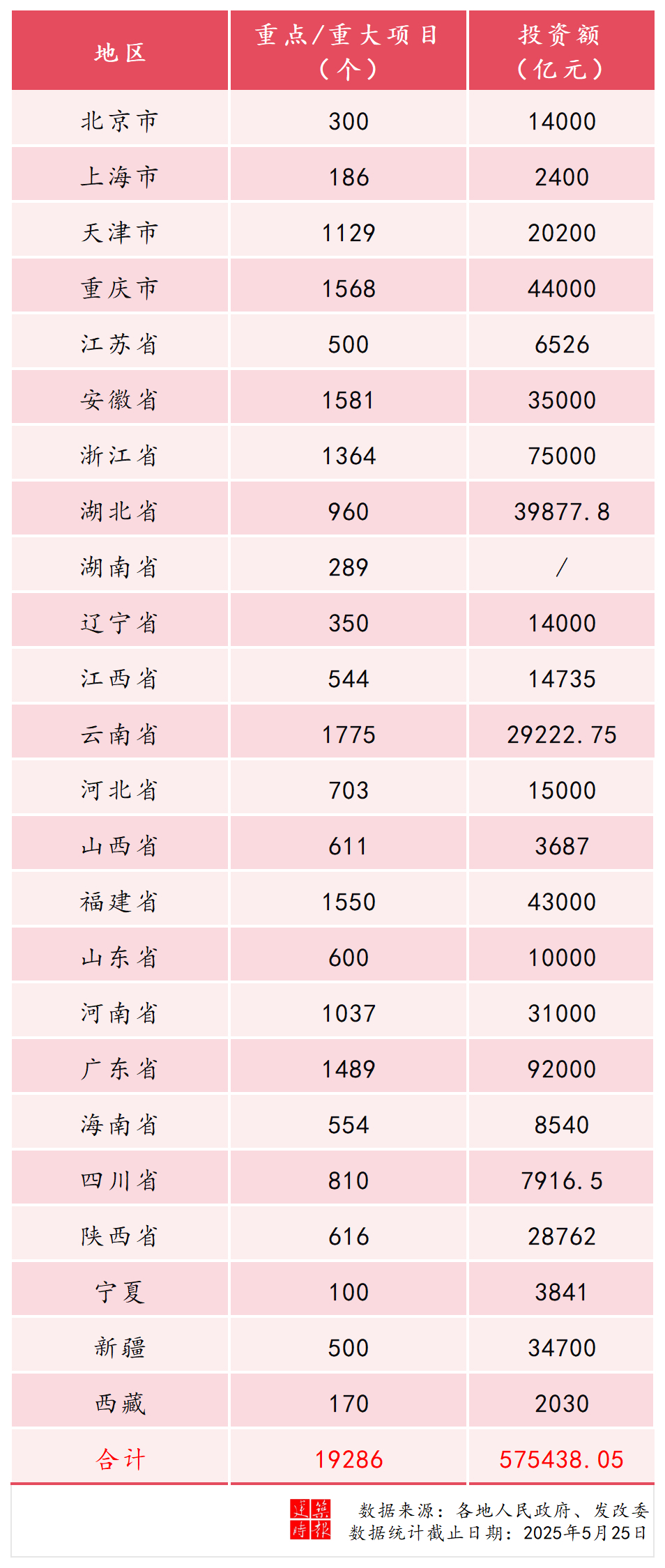 重大项目是经济发展的重要支点,也是高质量发展的关键抓手。经建筑时报统计,截至目前,全国已有24个地区发布2025年重点工程项目相关投资计划,重点项目合计超1.9万个,总投资额合计达57.5万亿元。