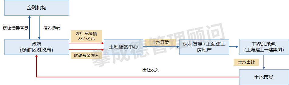 案例:上海市杨浦区大桥113街坊棚户区改造项目,以“杨浦区财政局发行23.1亿元专项债(期限10年、年利率4%)+区级财政自有资金”构成资金池,注入土地储备中心用于土地整理;后续土地经开发后进入土地市场出让,出让收入回流财政偿还债券本息,形成“发债-建设-收益-偿债”的完整资金闭环。