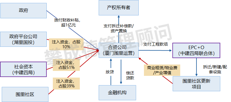 案例:央企中建四局以社会资本方身份,参与到厦门市城中村现代化治理投资项目中来,开启了创新版的“EPC+O”政企合作模式。在财政投资10年总计超1亿元的基础上,中建四局通过搭建平台引入社会资本,3年投资不少于3000万元,主要为金巷历史文化街、东围创意集市及西里停车场等提供既有建筑改造和翻新。