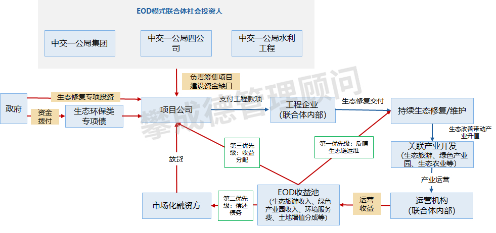 EOD(生态环境导向的开发)模式是以生态修复为切入点,联动文旅、科创等产业开发,构建“生态改善—产业增值—收益反哺”闭环,实现“生态效益+经济效益”双赢的开发模式。优势是易承接“生态+产业”一体化EPC业务,专项技术能力可筑竞争壁垒,还能延伸长期维护合作;缺点是前期生态修复投入大、现金流压力高,对跨领域协作能力要求高,且项目依赖政策,产业收益不及预期时风险较大。
