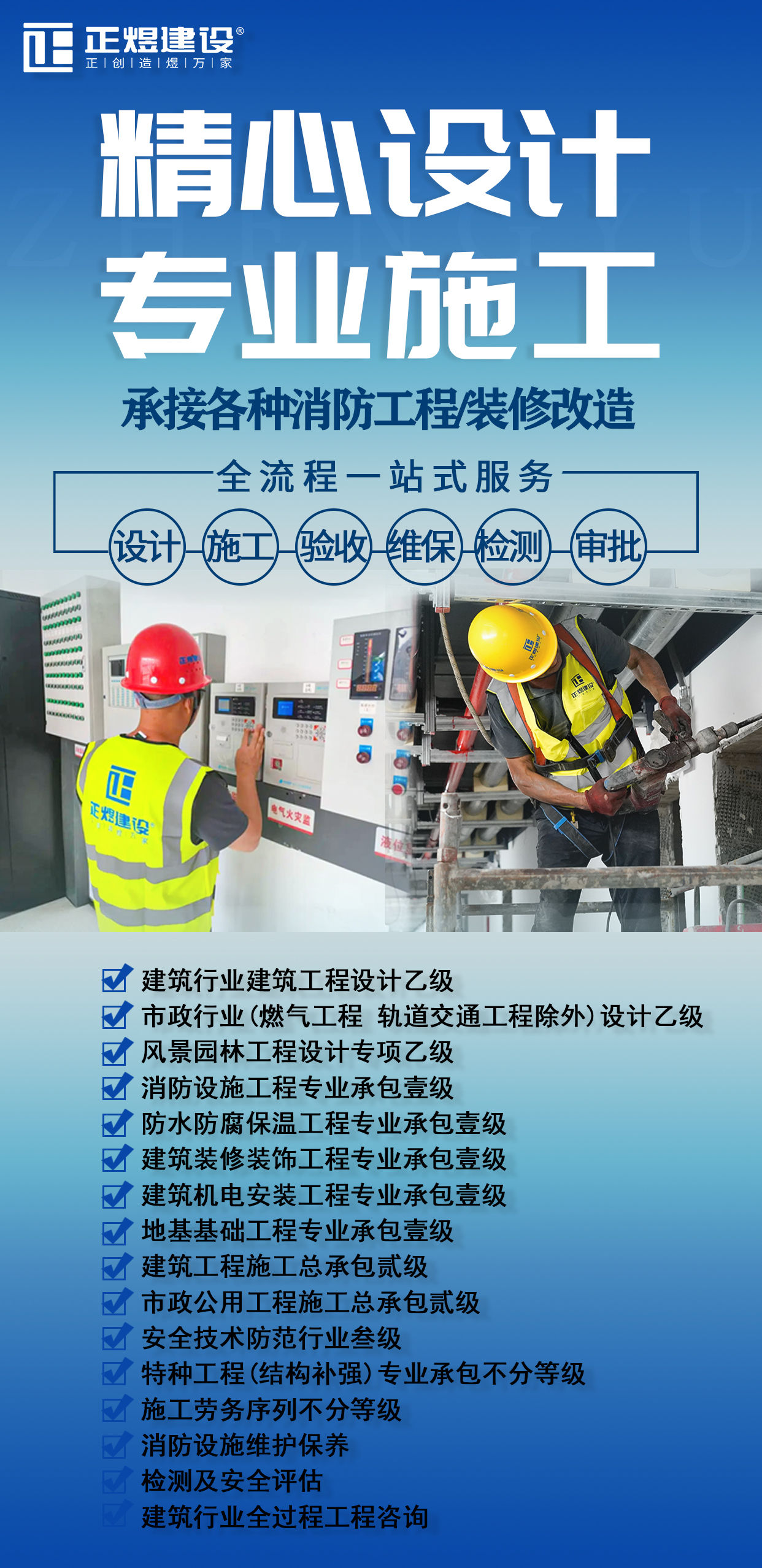 正煜建设集团深耕行业数十年,提供装修、消防、机电安装、加固工程等设计图审,施工改造,消防检测维保,报建验收等全方位一站式服务,承接过厂房、办公、医疗、教培、商超、餐厅、酒店公寓、歌舞娱乐、放映游艺等各类业态项目,公司资质齐全,团队专业,吃通规范,跑通流程,全程护航,从设计施工到审批,助你高效通过验收!