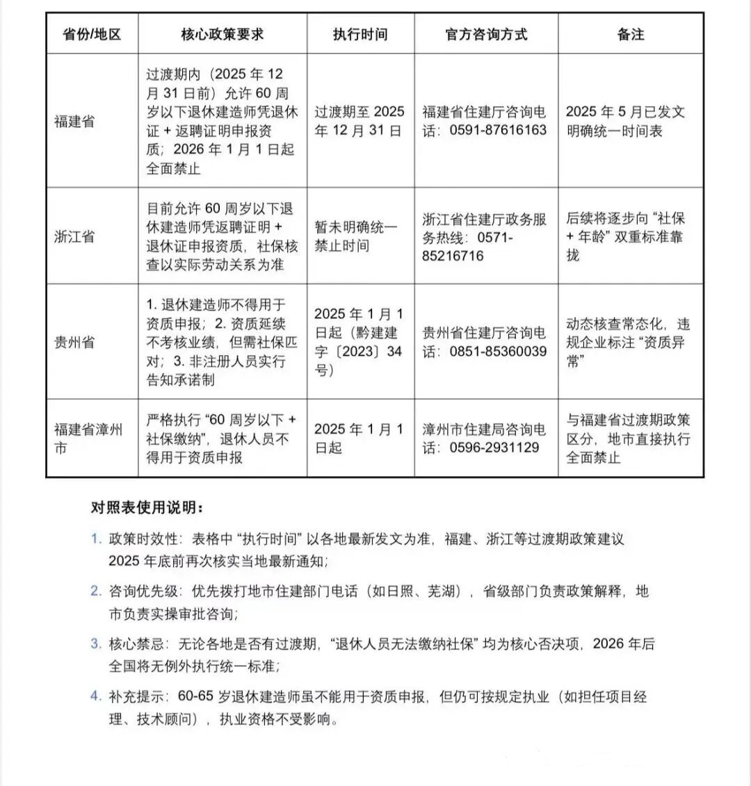 除上述地区外,福建漳州、贵州、湖南等地也出台了类似规定。这一政策趋势正在全国范围内蔓延,退休建造师在资质申报领域即将彻底出局。