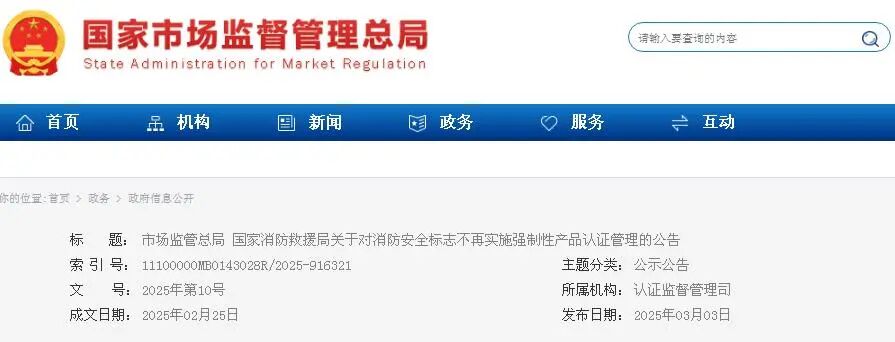 市场监管总局 国家消防救援局关于对消防安全标志不再实施强制性产品认证管理的公告 2025年第10号