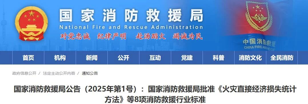 国家消防救援局批准《火灾直接经济损失统计方法》等8项消防救援行业标准(标准文本附后),现予公布。