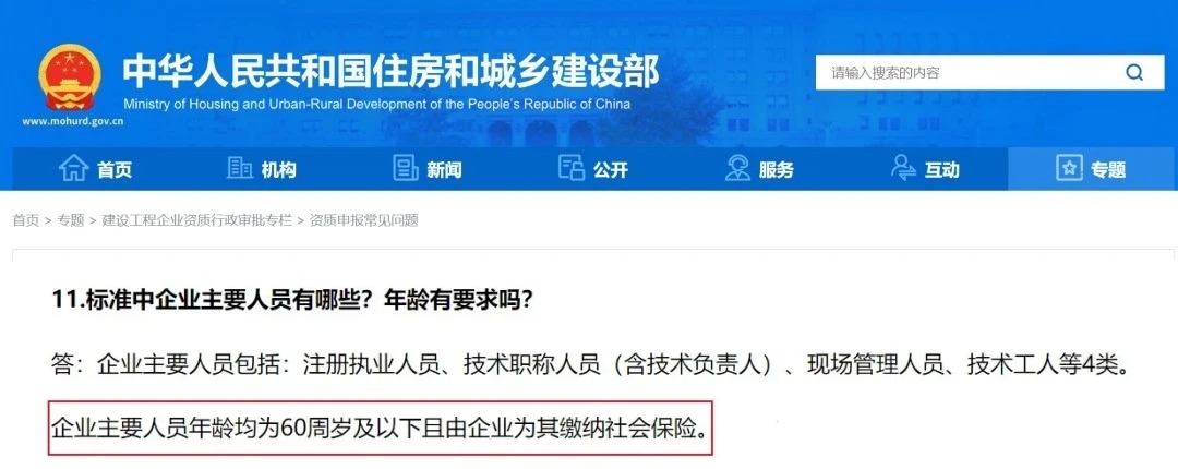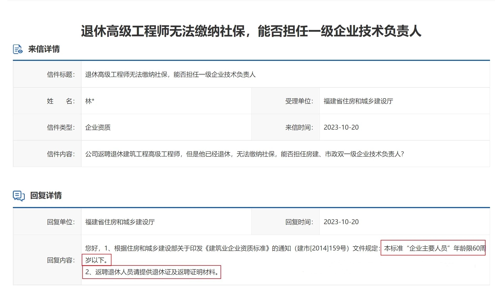 安徽住建厅明确回复:不可以!根据《建筑业企业资质管理规定和资质标准实施意见》三十八条第5款,“企业主要人员应满足60周岁及以下由企业为其缴纳社会保险的要求”。