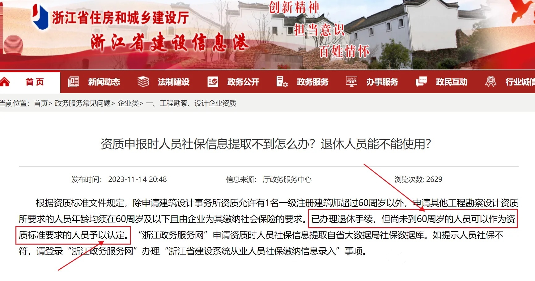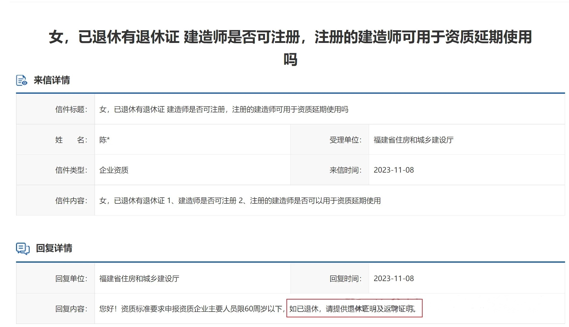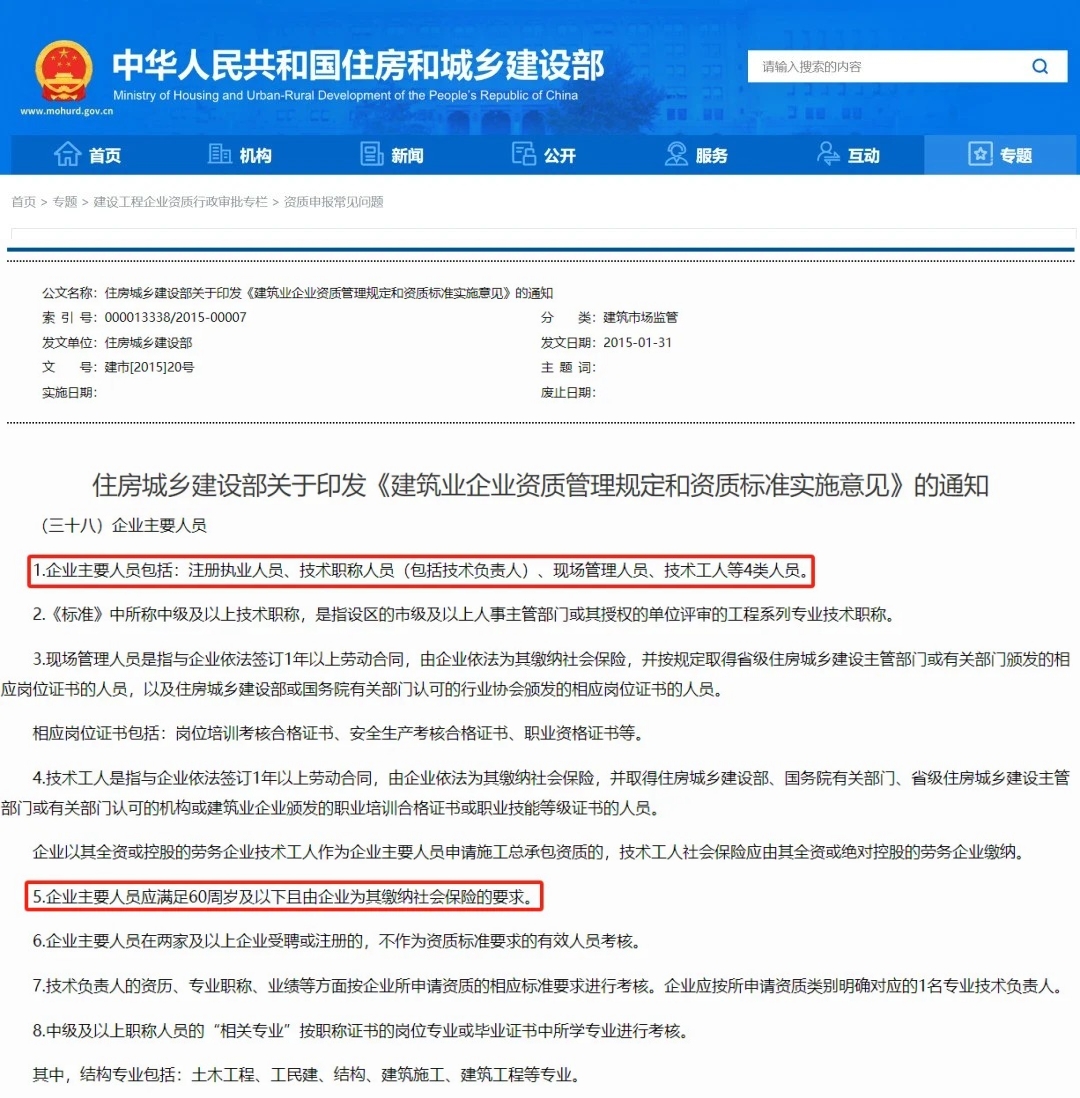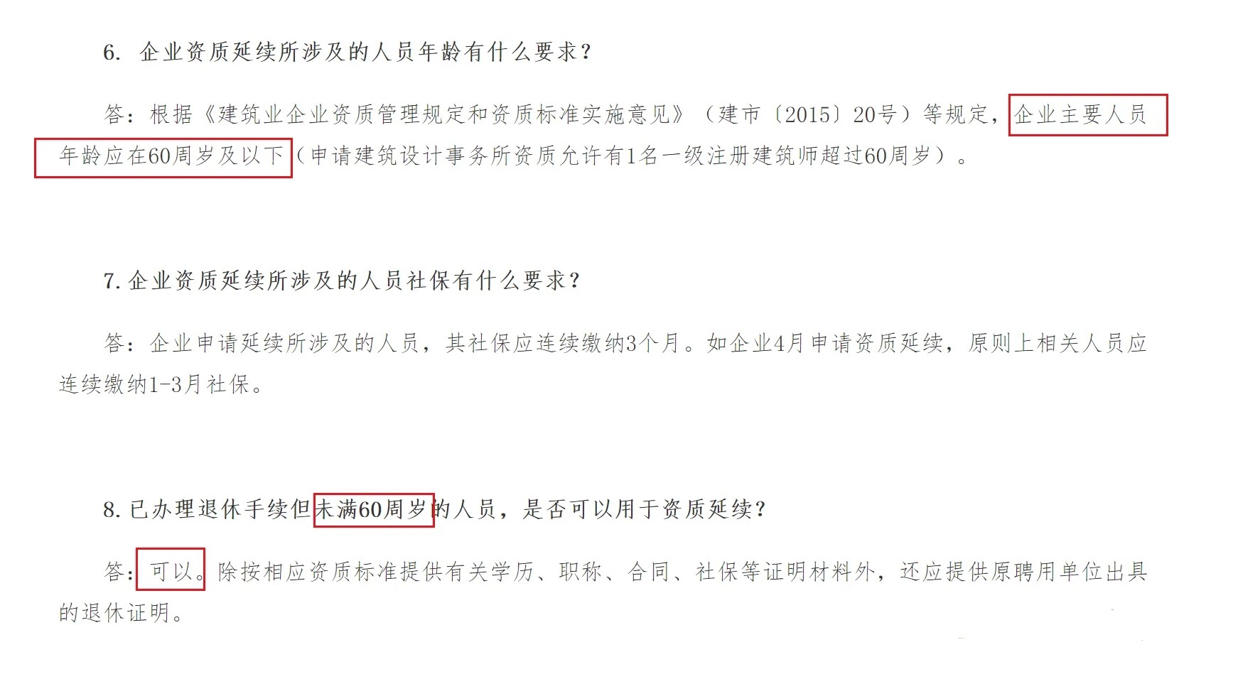 依据省住建厅厅长信箱关于“已办理退休手续但未满60周岁的人员,是否可以用于资质延续”的答复。根据《建筑业企业资质管理规定和资质标准实施意见》三十八条第5款,“企业主要人员应满足60周岁及以下且由企业为其缴纳社会保险的要求”,即日起,已办理退休手续但未满60周岁的人员,不可以用于资质申报(新设立、增项、延续等)。