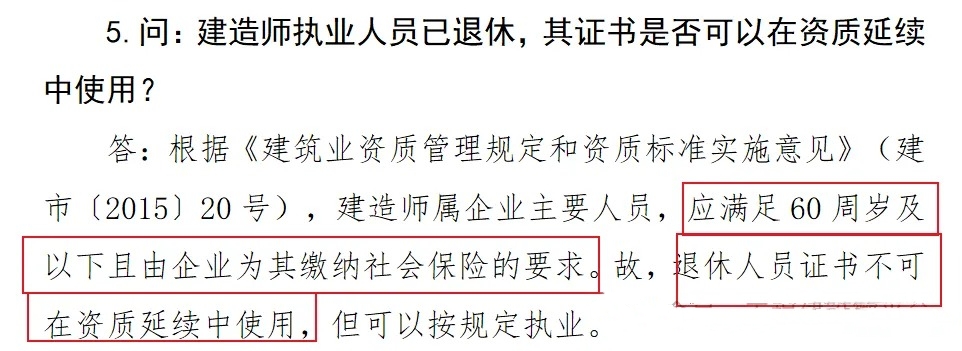 第五条:问:建造师执业人员已退休,其证书是否可以在资质延续中使用?