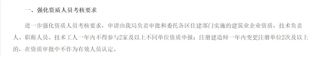 1、进一步强化资质人员考核要求,申请由我局负责审批和委托各区住建部门实施的建筑业企业资质,技术负责人、职称人员、技术工人一年内不得参与2家及以上不同单位资质申报;注册建造师一年内变更注册单位2次及以上的,在资质审批中不作为有效人员认定。