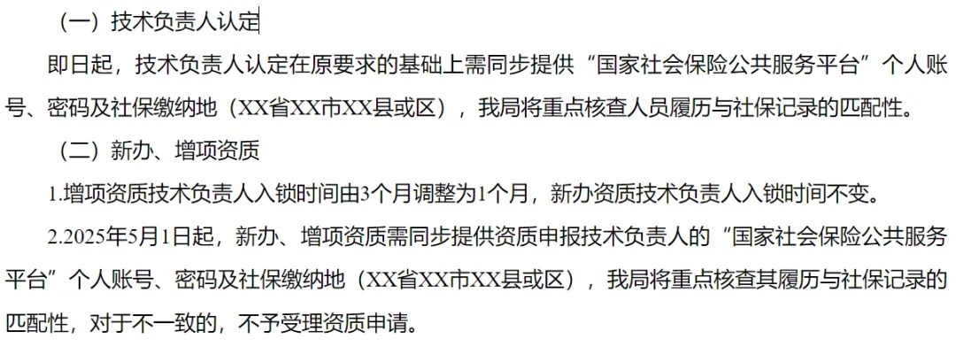 2025年5月1日起,新办、增项资质需同步提供资质申报技术负责人的“国家社会保险公共服务平台”个人账号、密码及社保缴纳地(XX省XX市XX县或区),我局将重点核查其履历与社保记录的匹配性,对于不一致的,不予受理资质申请。