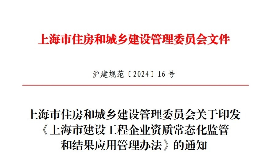 2024年12月,上海市住房城乡建设管理委印发《上海市建设工程企业资质常态化监管和结果应用管理办法》(沪建规范〔2024〕16 号)。本办法自2025年4月1日起施行,有效期至2029年12月31日。
