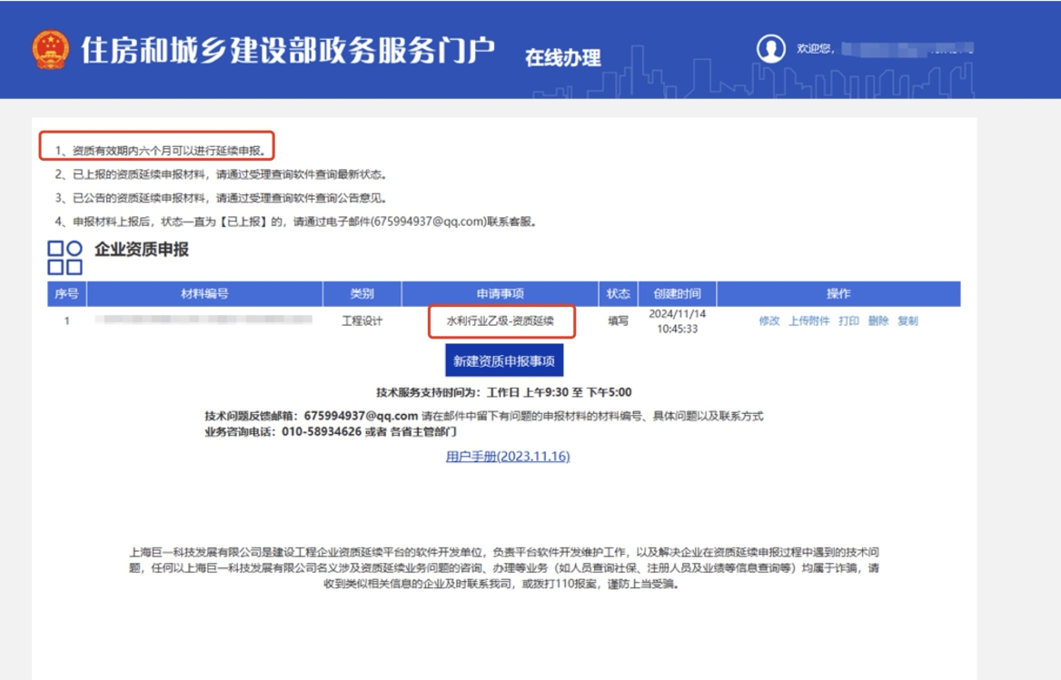 2、住建部政务服务网弹窗提示,延续时间调整通知,在资质有效期内6个月可以进行延续申报。