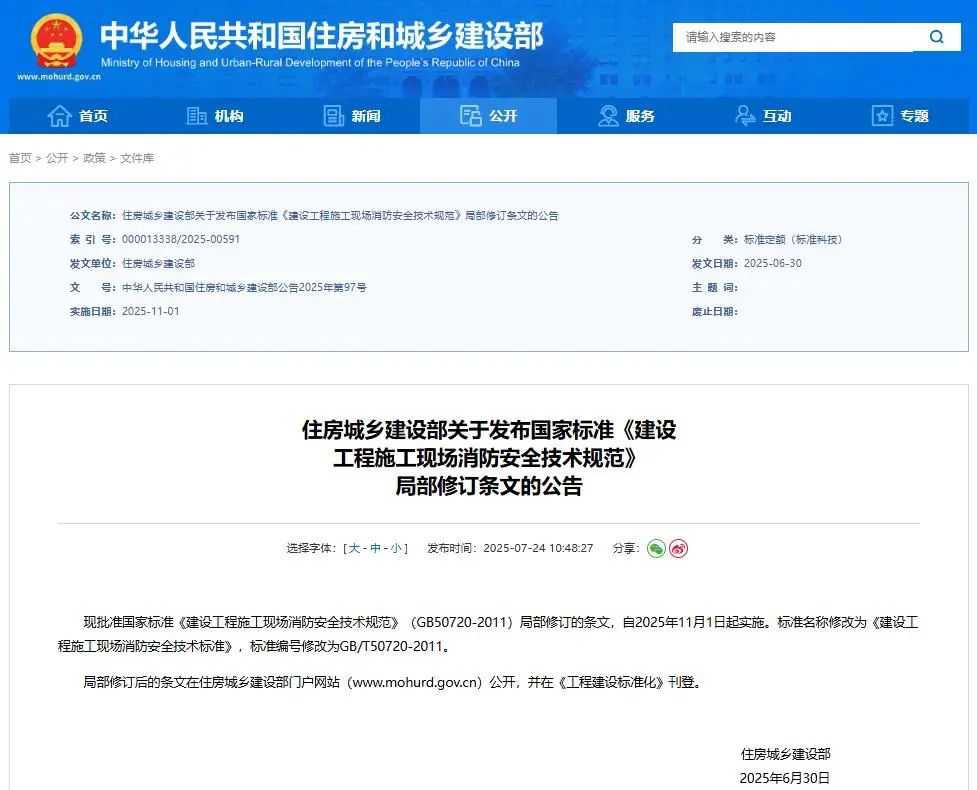 《建设工程施工现场消防安全技术标准》(GB/T 50720-2011,2025年版)是对原《建设工程施工现场消防安全技术规范》(GB 50720-2011)的局部修订,由住房和城乡建设部于2025年6月30日批准,并将于2025年11月1日起实施。