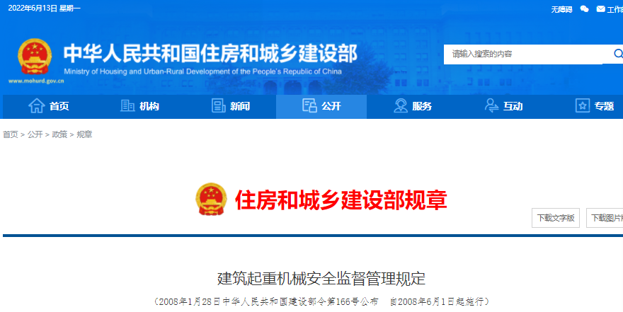 《建筑起重机械安全监督管理规定》是为了加强建筑起重机械的安全监督管理,依据《建设工程安全生产管理条例》《特种设备安全监察条例》《安全生产许可证条例》制定的规定。2008年1月8日,中华人民共和国建设部令第166号予以公布,自2008年6月1日起施行。
