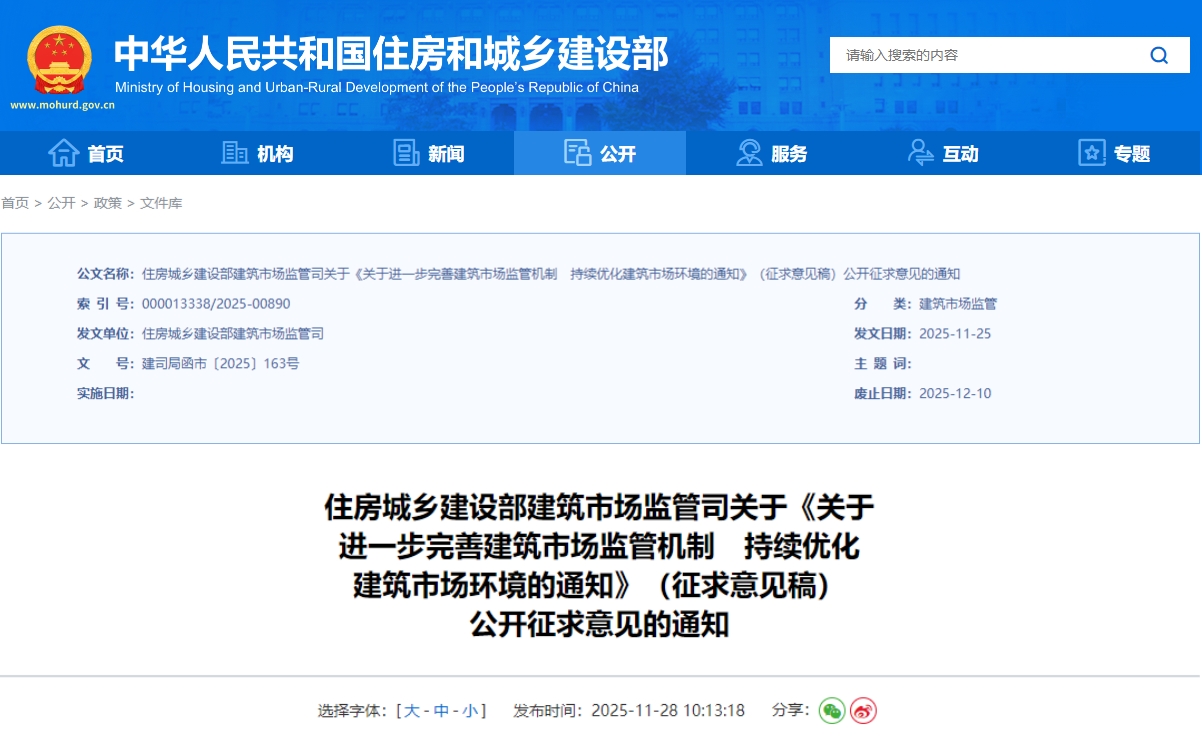 为贯彻落实《中共中央 国务院关于加快建设全国统一大市场的意见》精神,进一步夯实建筑市场经营主体责任,强化建筑市场监管,优化建筑市场环境,加快构建“宽进、严管、重处”建筑市场监管机制,我们研究起草了《关于进一步完善建筑市场监管机制 持续优化建筑市场环境的通知》(征求意见稿),现向社会公开征求意见。有关单位和个人可于2025年12月10日前,通过以下途径和方式提出反馈意见。