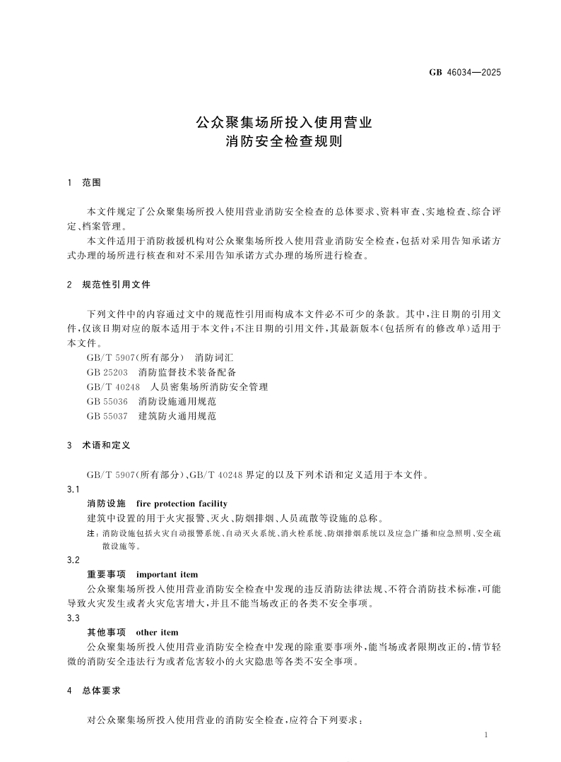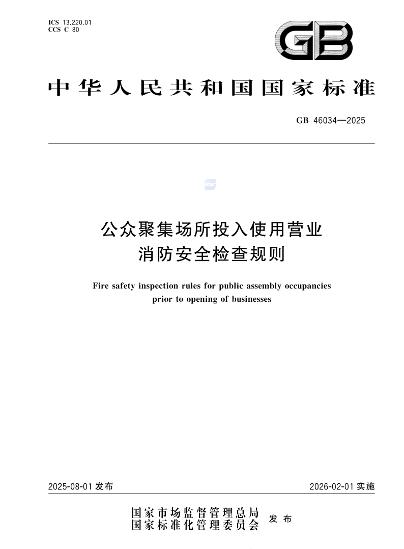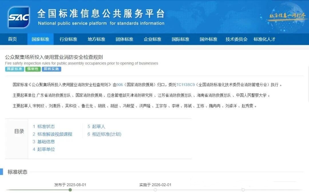 强制性国家标准《公众聚集场所投入使用营业消防安全检查规则》全文已经正式发布,将于2026年2月1日起正式实施。