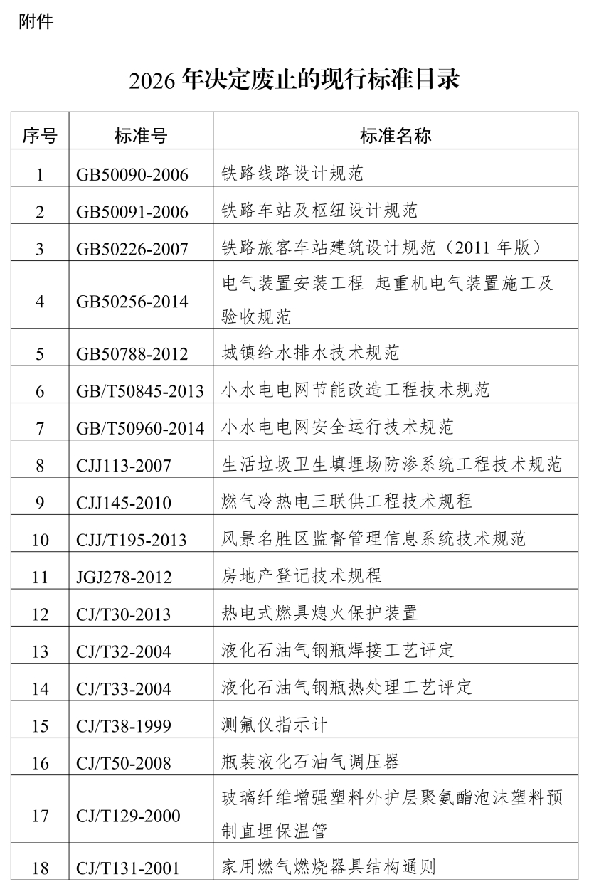 近日,住房城乡建设部对现行工程建设国家标准和行业标准进行了全面复审,决定废止《铁路线路设计规范》等72项现行标准,具体如下: