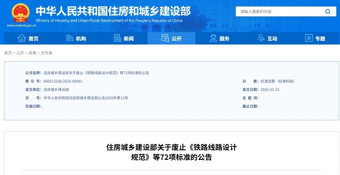 住建部:决定废止《铁路线路设计规范》等72项标准