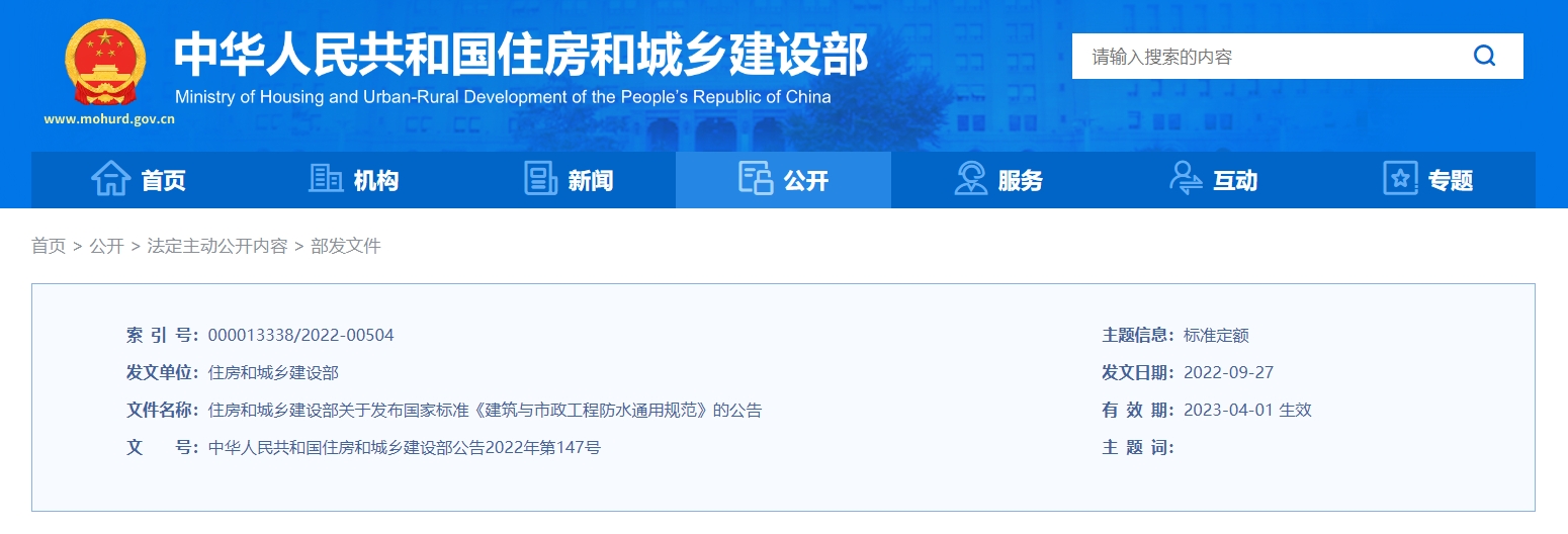 住房和城乡建设部关于发布国家标准《建筑与市政工程防水通用规范》的公告
