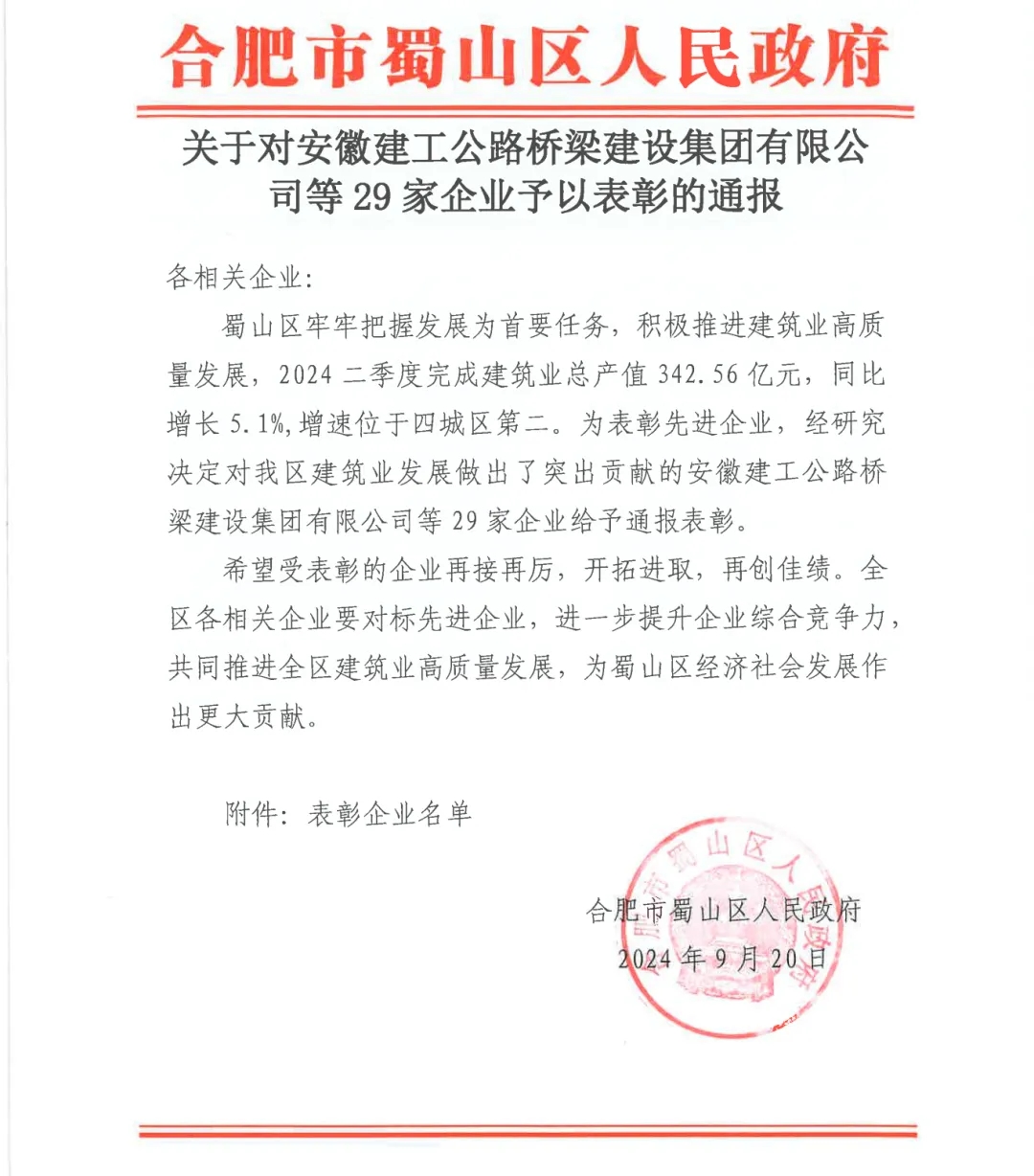 在中华人民共和国成立75周年之际,正煜建设集团严格按照蜀山区委、区政府各项工作部署,抓细抓实经济发展工作,为蜀山区建筑业高质量发展作出重要贡献,获得合肥市蜀山区人民政府二季度通报表彰。