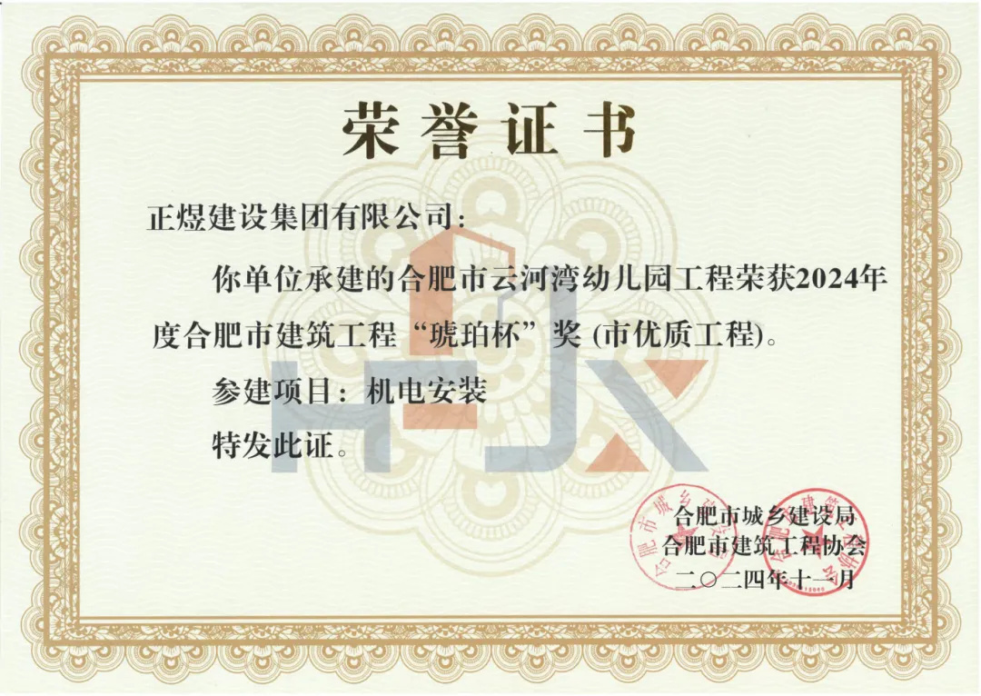 由正煜建设集团承建的合肥市云河湾幼儿园工程荣获2024年度合肥市建筑工程“琥珀杯”奖(市优质工程)。该奖项的获得,彰显了正煜建设集团在机电安装领域的专业水准和精益管控能力。