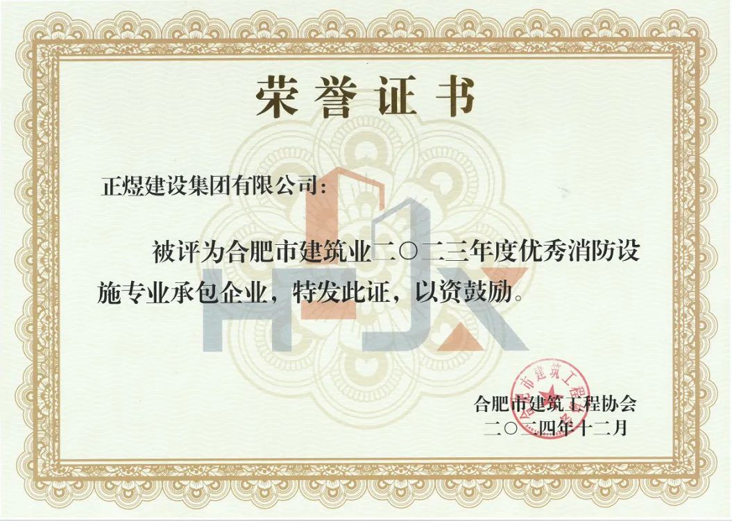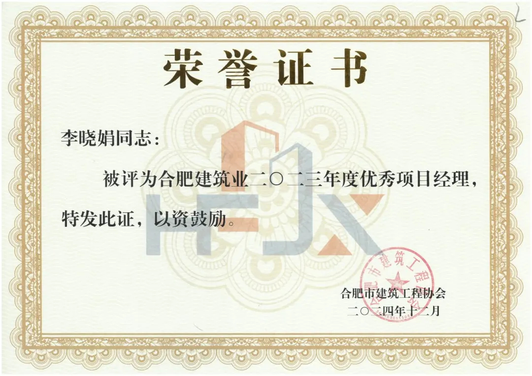 近日,合肥市建筑工程协会组织开展2023年度全市建筑业评比表彰活动,正煜建设集团荣获“合肥建筑业2023年度优秀施工企业”、“合肥建筑业2023年度优秀消防设施专业承包企业”,项目经理李晓娟荣获“优秀项目经理”称号,工程师凌震荣获“优秀消防工程师”称号。