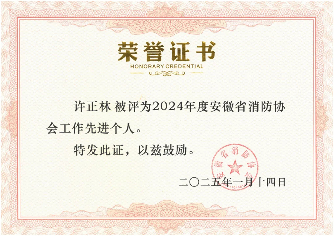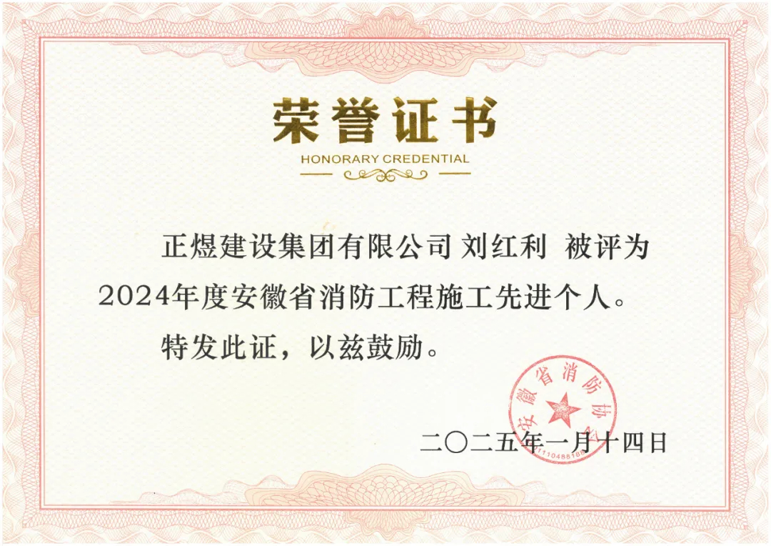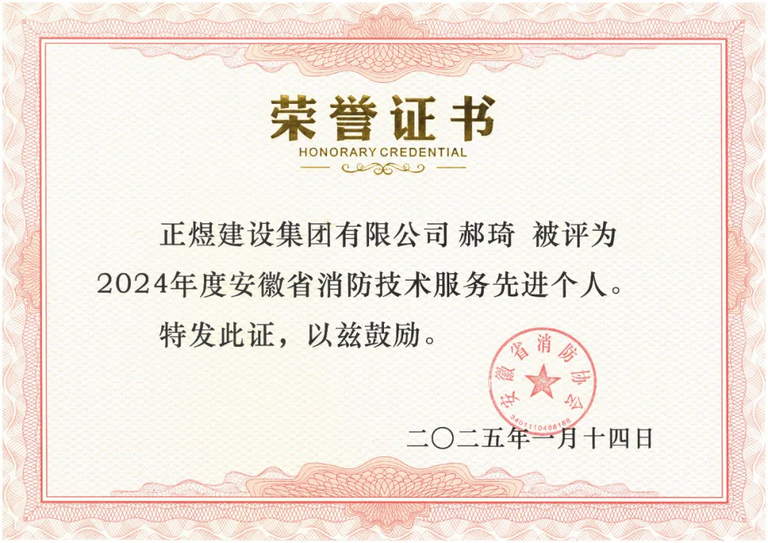 正煜建设集团获评“2024年度安徽省优秀消防工程施工企业”,董事长许正林获评2024年度安徽省消防协会工作先进个人,刘红利获评2024年度安徽省消防工程施工先进个人,郝琦获评2024年度安徽省消防技术服务先进个人。
