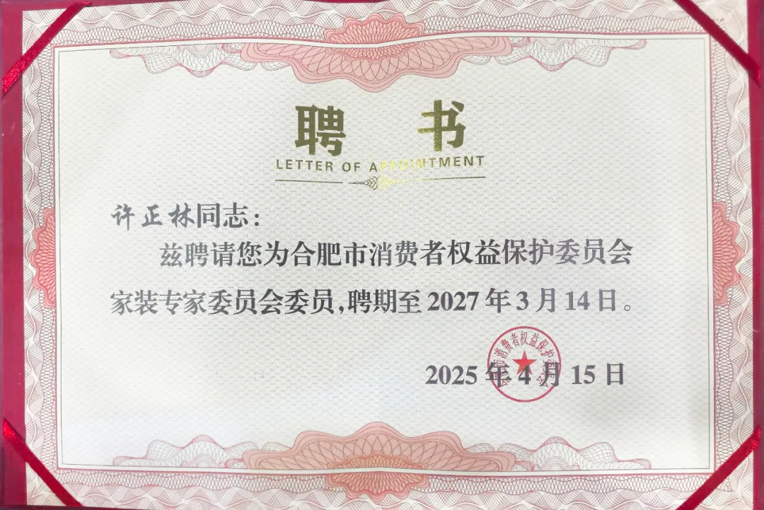 4月15日,由合肥市消费者权益保护委员会与合肥市建筑装饰协会共同开展的合肥市第十二次家装大巡检活动启动仪式隆重举行。正煜建设集团董事长许正林受邀参加活动并获聘为家装专委会委员,为期三年。